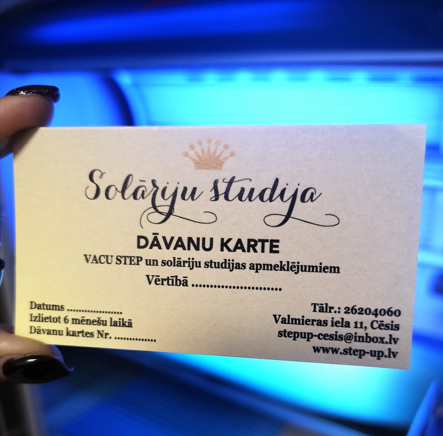 Uzzini vairāk Īpašie piedāvājumi & jaunumi 01 Dāvanu kartesIepriecini savus mīļos ar dāvanu karti, kuru iespējams izmantot gan solārija apmeklējumiem, krēmu iegādei, gan uz kādu no mūsu unikālajiem trenažieriem! PērkotIegūsti 20,00 EUR25,00 EUR 50,00 EUR65,00 EUR 100,00 EUR145,00 EUR Jaunumi No data was found